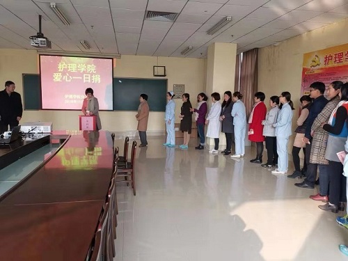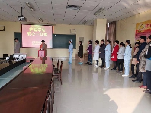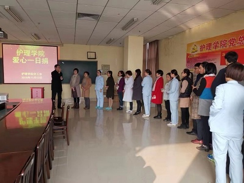 2018年11月12日下午,护理学院组织全体教师在217会议室开展了“爱心一日捐”捐款活动。活动中,学院领导高鸿、陈玉芹、刘鹏飞带头捐款,全体教师踊跃参与,慷慨解囊。