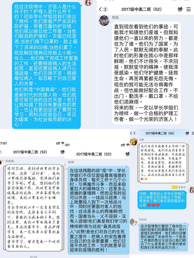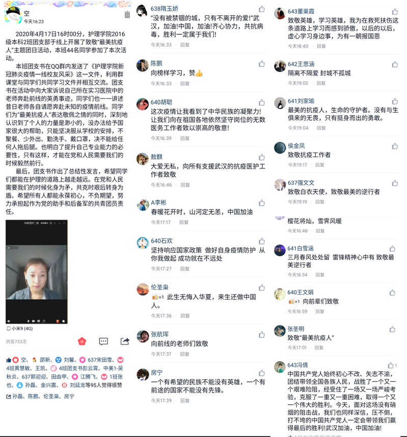 活动通知发布后,各班级团支部迅速行动,充分利用网络资源积极开展活动。通过QQ群、微信群、钉钉、腾讯会议等多种线上平台组织广大团员青年深入学习优秀校友们抗击疫情的先进事迹,感悟抗疫一线校友们舍己为人、勇敢逆行的精神。