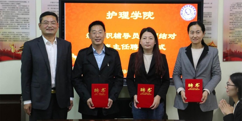 为全面落实《普通高等学校辅导员队伍建设规定》、《济宁医学院班主任管理办法(试行)》、《中共济宁医学院委员会“三全育人”工作实施方案》等文件精神,进一步强化辅导员队伍建设和学生教育管理工作,着力提高新入职辅导员、班主任的综合素质和工作能力,提升“三全育人”工作水平,2020年10月20日,护理学院举办了新入辅导员拜师结对暨班主任聘任仪式。护理学院党总支书记高鸿、副书记副院长陈玉芹、副书记杨绪霞参加会议。仪式由学生管理科科长蒋红主持。