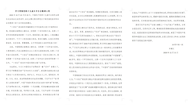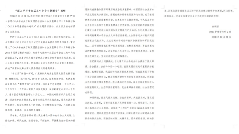 为进一步深入学习贯彻宣传党的十九届五中全会精神,2020年12月29日-2021年1月3日,学院团总支组织开展了“学习贯彻党的十九届五中全会精神”主题征文活动,并组织各班级团支部开展了“学习党的十九届五中全会精神”主题团日活动。