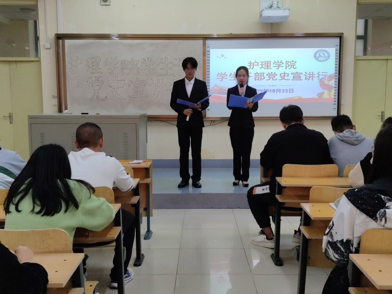 10月23日中午,我院于教学楼305举办“学史明智守初心,砥砺前行勇担当”学生干部党史宣讲活动。护理学院学生第一、二党支部党员代表、学生会主席团及各班学生干部代表参加本次大会。