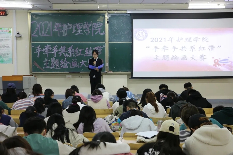 为促进当代大学生身心健康发展,推动同学们关注艾滋病防治、关爱艾滋病病人,营造零歧视氛围,10月29日晚,护理学院“手牵手共系红丝带”主题绘画大赛在教学楼211成功举办,各年级同学积极参加。