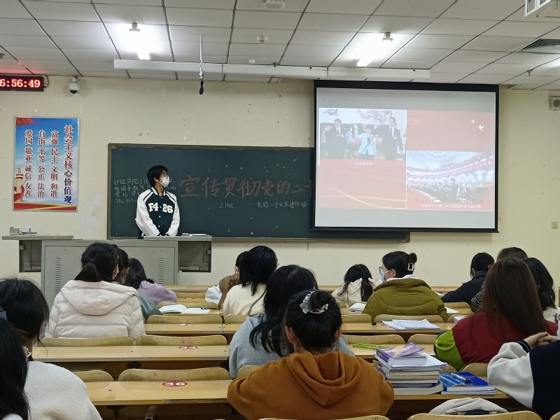 护理学院团总支以组织团干部进教室、进课堂的形式,开展“学习宣传贯彻党的二十大精神”主题宣讲、主题团课。各团支部通过深学细悟习近平总书记在中国共产党第二十次全国代表大会上的重要讲话精神,组织班级同学深刻理解新时代坚持和发展中国特色社会主义的一系列重大理论和实践问题,引导青年学生更加紧密地团结在以习近平同志为核心的党中央周围,高举中国特色社会主义伟大旗帜,坚定道路自信、理论自信、制度自信、文化自信。