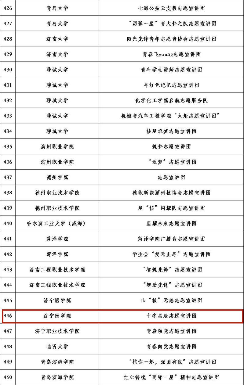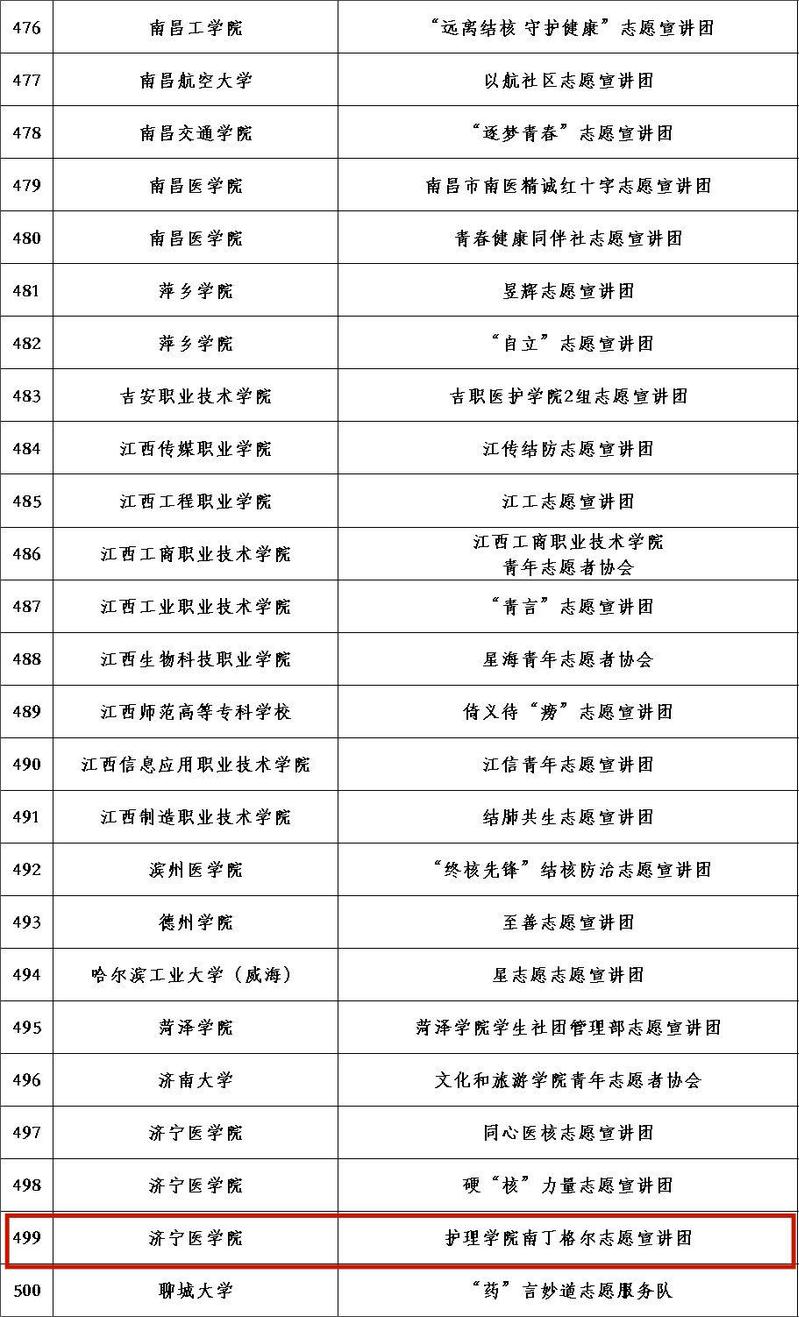 护理学院十字星辰志愿宣讲团入选2023年全国大学生“两弹一星”精神志愿宣讲团;护理学院南丁格尔志愿宣讲团入选2023年全国大学生“防治结核 志愿有我”志愿宣讲团。
