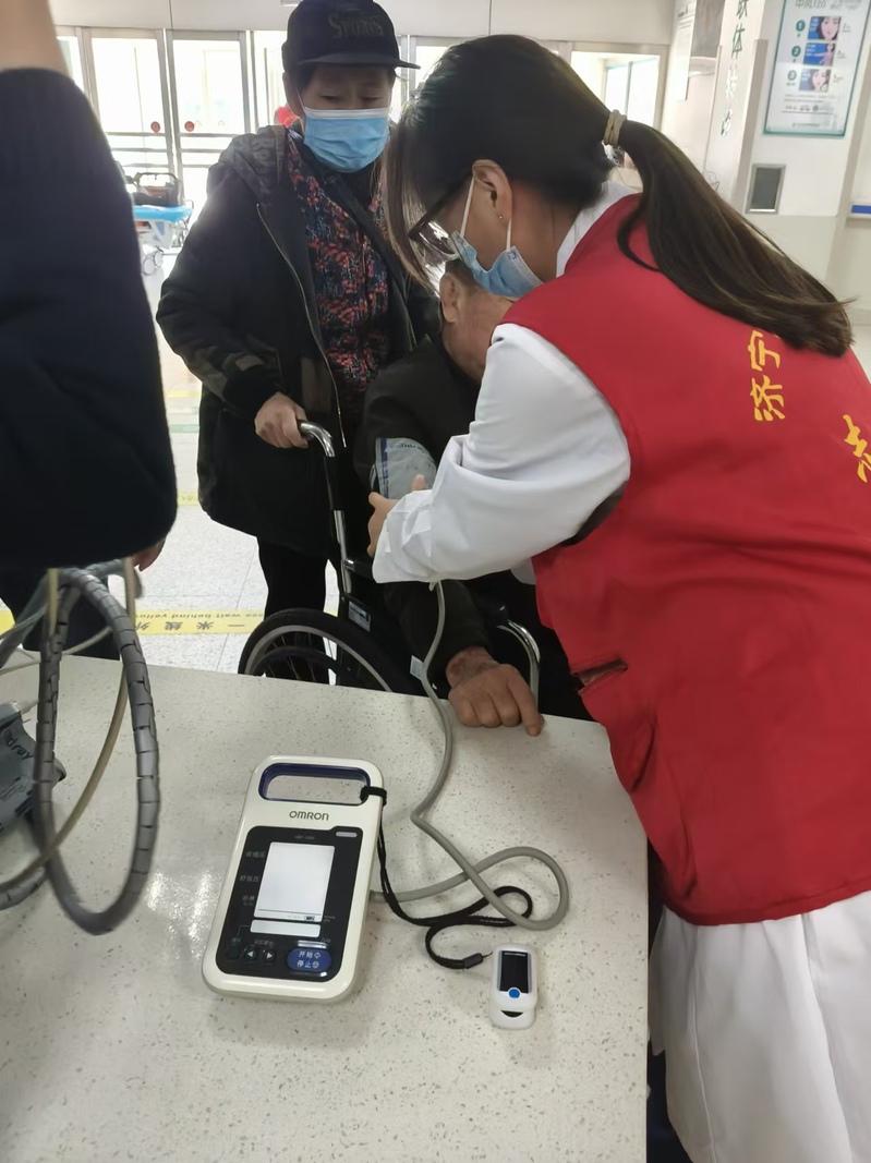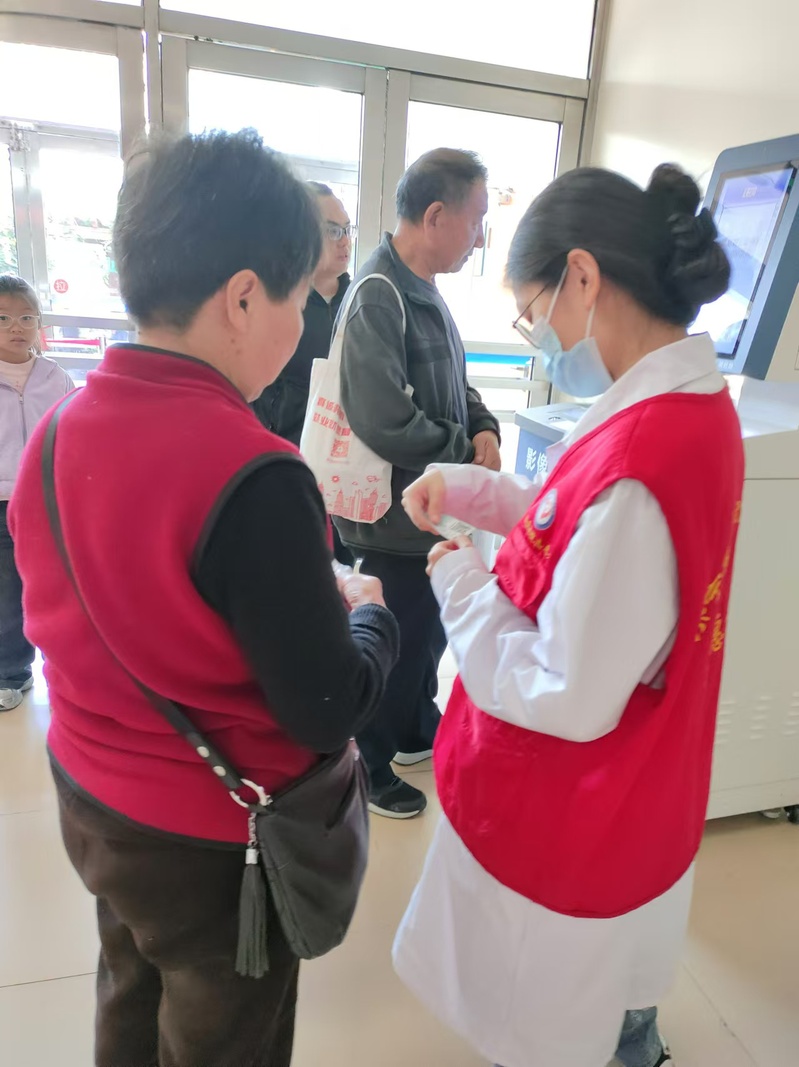 活动期间,志愿者们为患者以及家属提供导医导诊服务,在自助缴费机前帮助病人挂号缴费、取号查询,解决了他们不会使用机器的难题;告知科室方向与取药流程,与需要帮助的人交流传递关心与关怀。此外,根据老年患者的实际需求,志愿者还提供个性化的服务,为他们测量血压,提供暖心服务。