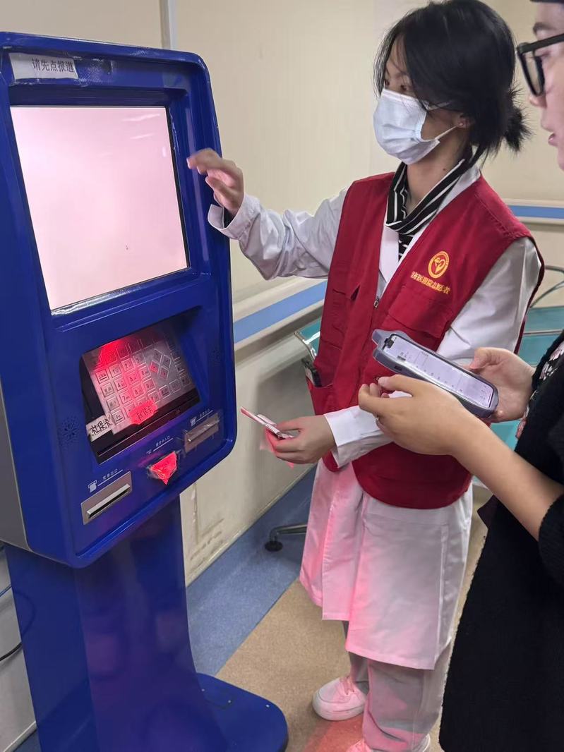 活动前,指导老师向志愿者们详细地讲解了自动缴费机的使用方法、医院的科室布局以及志愿者的行为规范,志愿者们在指导老师的教导下在各自的岗位上帮助患者及其家属预约挂号、打印收据单,为不熟悉医院布局的人带路,为行为不便的人推送轮椅,尽可能地为患者及其家属提供就医的便利。