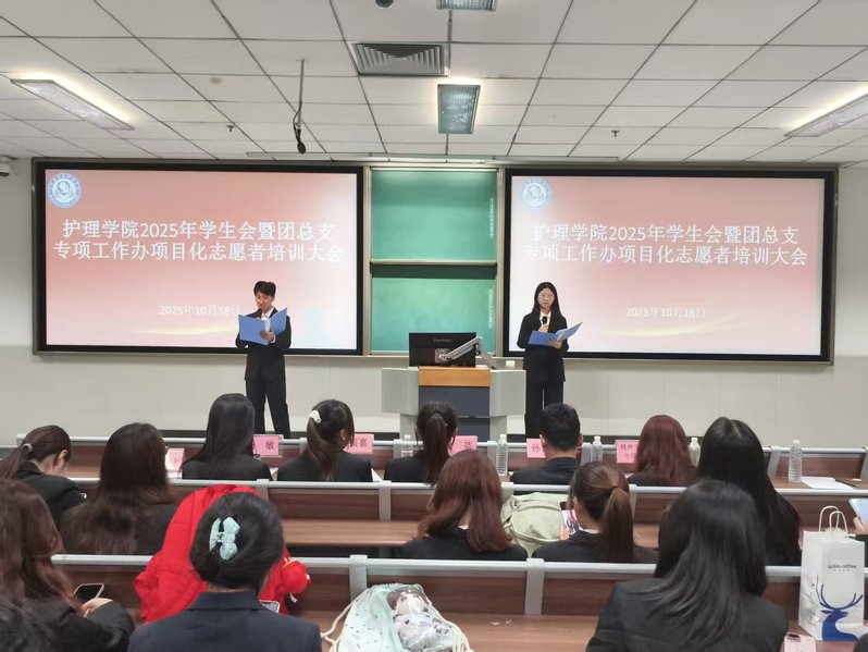 为强化学生干部责任担当,提升项目化志愿者团队的协作与业务能力,搭建高效服务桥梁,护理学院学生会暨团总支专项工作办于2025年10月18日在教学楼J203教室召开2025年项目化志愿者培训大会。