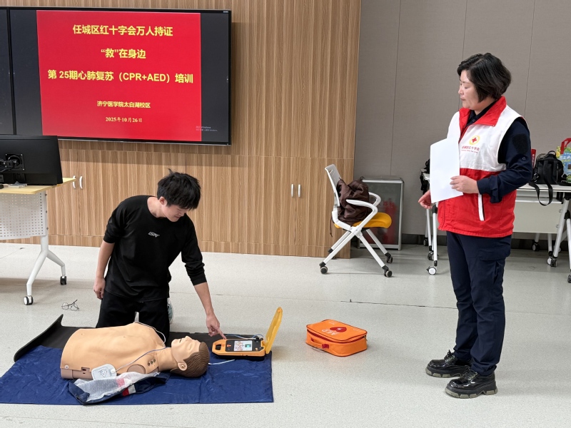 本次培训由护理学院联合太白湖新区卫健办、任城区红十字会共同举办,特邀领域内专家石磊、褚红滕主讲心肺复苏以及AED理论教学及实操练习。培训从心肺复苏按压的位置、深度、频率,再到AED的开机、电极片的粘贴、语音提示响应等操作步骤,每一个细节都严格把关,确保学生操作规范、准确。
