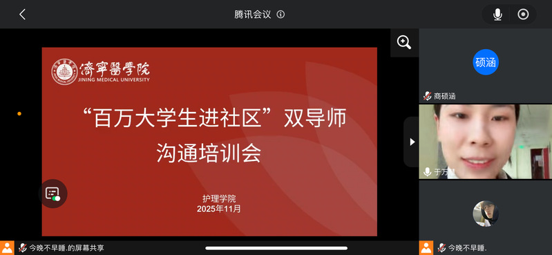 此次线上双导师沟通培训会,是护理学院深化“校社协同育人”模式、创新实践能力培养路径的重要举措,既打破时空限制保障培训全覆盖,又通过校社双导师优势互补,精准对接社区护理需求与护生能力短板,为护生即将开展的社区实践活动筑牢沟通能力基础。两位导师均表示:下一步,护理学院将持续优化线上线下融合的实践育人模式,充分发挥校内专业导师的理论引领作用与校外社区导师的实战指导优势,常态化开展社区服务技能培训、线上实践督导等系列活动,不断提升护生的社会服务能力与实践育人质量,推动“百万大学生进社区”活动走深走实,为社区健康服务事业发展注入青春力量。