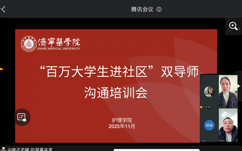 为推动“百万大学生进社区”志愿服务常态化、精准化开展,2025年11月23日,护理学院举办“百万大学生进社区”双导师线上视频会议沟通培训会,学院学生导师于万慧与京杭佳苑社区居委邓亮亮老师统筹推进社区志愿服务工作。