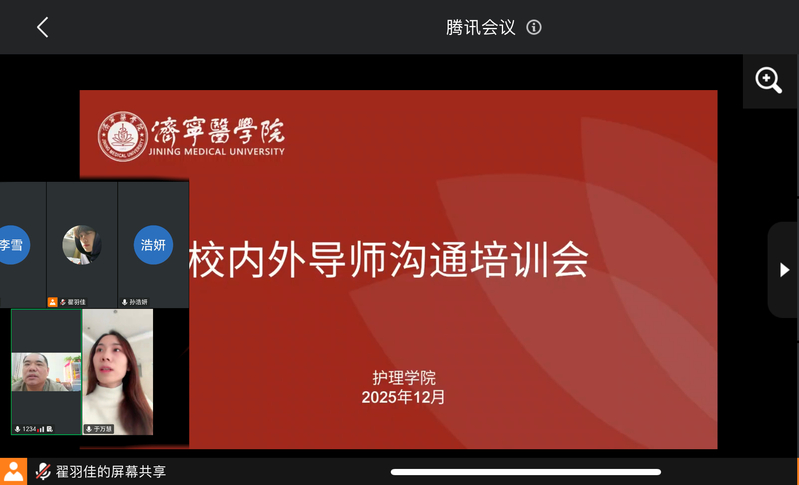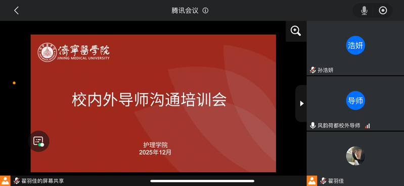 为畅通校内外导师协作链路,推动护理学院学生志愿服务与社区需求高效适配,2025年12月8日,护理学院以线上形式组织召开校内外导师沟通培训会。护理学院校内导师于万慧、风韵荷都社区校外导师张聪通过线上会议平台参会,聚焦护理专业学生志愿服务对接核心事宜,展开针对性交流,为后续实践活动有序推进搭建线上沟通桥梁。